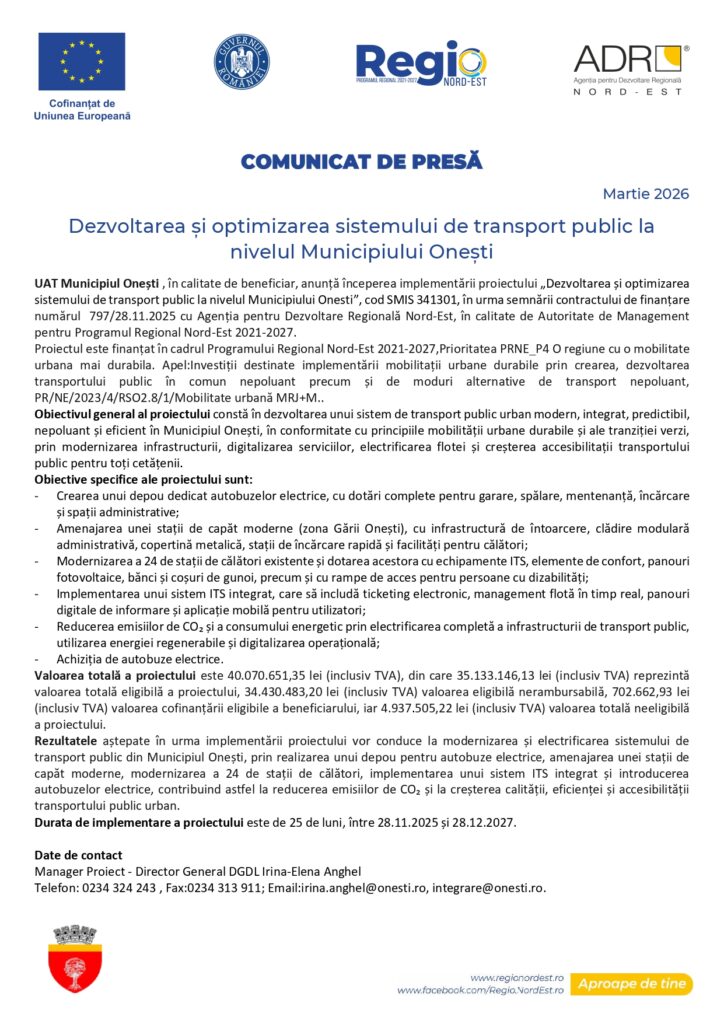 HomeȘtiriDezvoltarea și optimizarea sistemului de transport public la nivelul Municipiului Onești